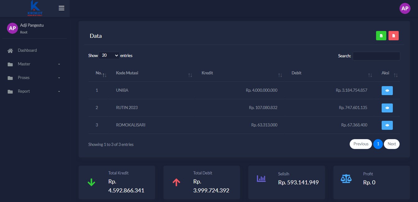 Merupakan aplikasi pencatatan keluar masuknya uang untuk kebutuhan dalam perusahaan kontraktor. Dengan tercatatnya setiap pengeluaran dan pemasukan dalam perusahaan, membuat laporan keuangan menjadi lebih akurat. Dilengkapi dengan fitur eskpor PDF dan Excel menjadikan pembuatan laporan rekapitulasi menjadi lebih mudah.