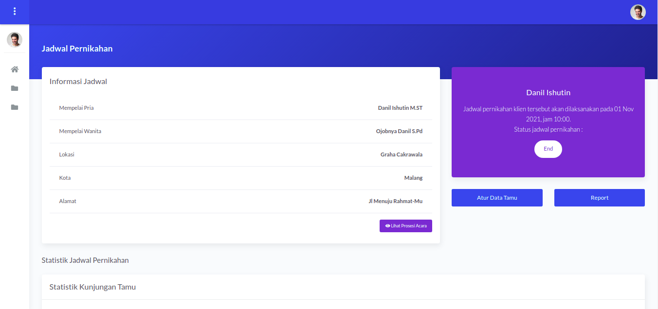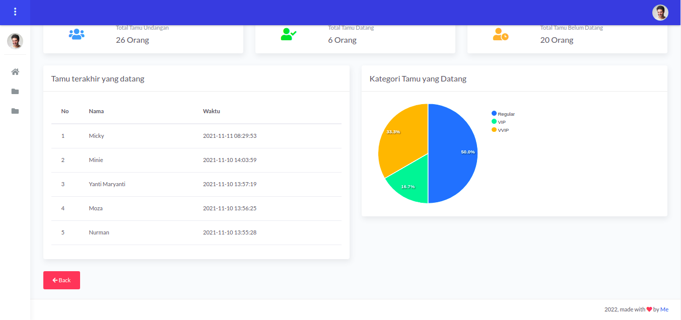 Dibuat untuk membantu pekerjaan pelaku Wedding Organizer. Aplikasi ini dapat membuat atau mencetak daftar undangan beserta Barcode tamu undangan. Sehingga ketika tamu tersebut datang, cukup dengan melakukan scan barcode pada petugas yang tersedia. Lalu pada petugas MC, akan muncul notifikasi di monitor siapa saja tamu yang datang secara realtime