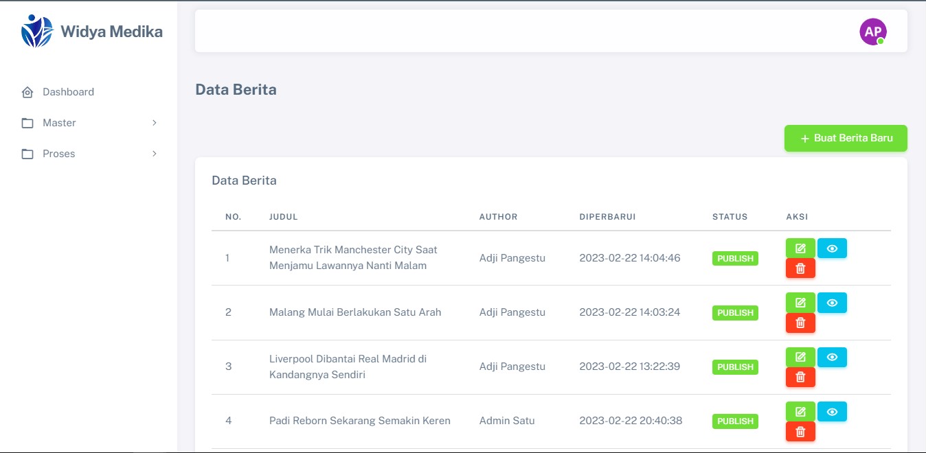 Halaman CMS untuk mengatur tampilan website Widya Medika. Ada juga fitur untuk membuat berita, mengedit berita dan menghapus berita. Selain itu ada juga halaman setting untuk mengatur banner website dan juga link sosial media.
